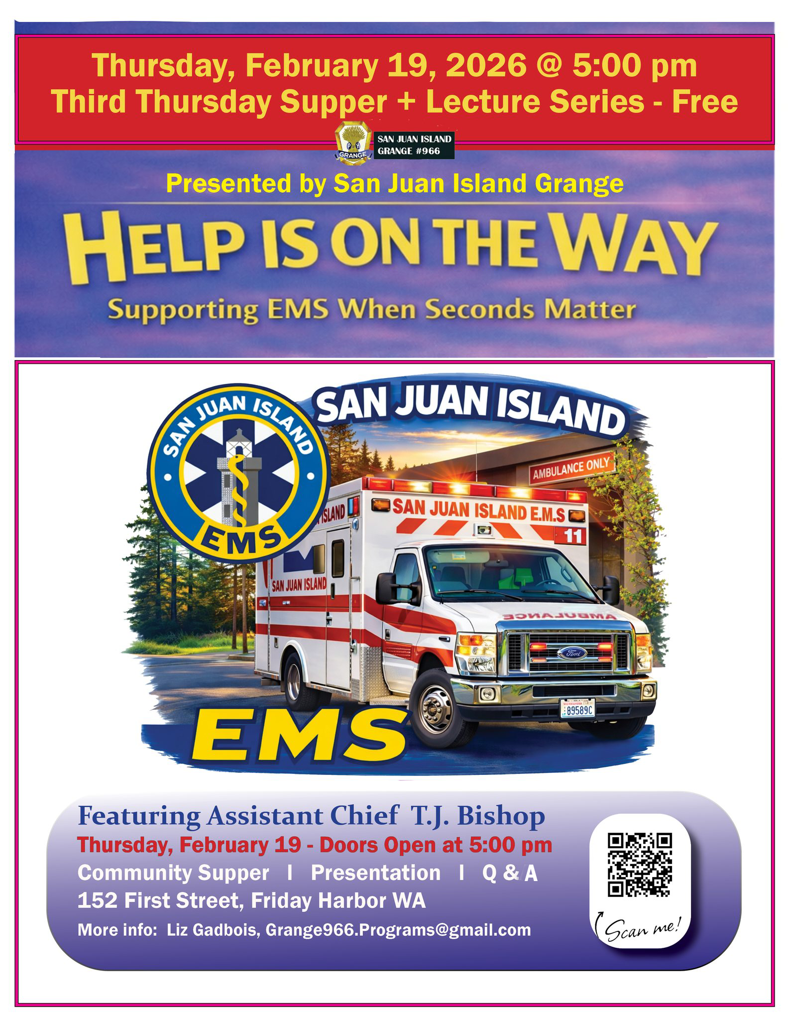 The evening will feature Assistant Chief T.J. Bishop of San Juan Island EMS, who will  share clear, evidence-based guidance on what to do in a medical emergency — including  when to call 911, how to remain calm, and how to provide appropriate care until  professional help arrives. The presentation is designed for all ages and experience levels  and reflects the realities of emergency response in a rural island community.