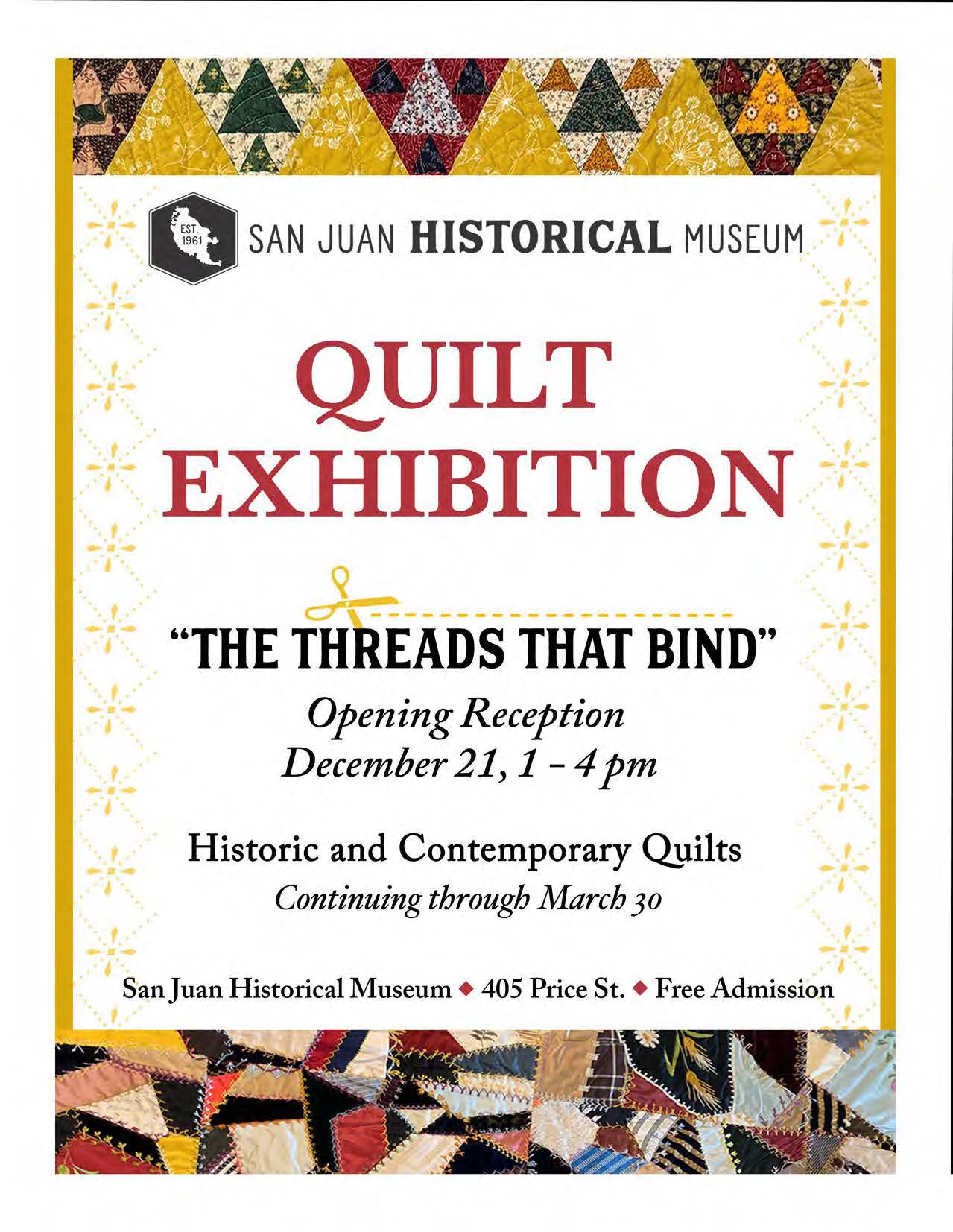 The San Juan Historical Museum is proud to announce the opening of our Quilt Exhibition, “The Threads that Bind.” From the signed and dated Crazy Quilts of the late 1800s to the striking art quilts of today, we celebrate the evolution of women’s craft that celebrates the evolution of quits for home and hearth, utility and artistic expression.