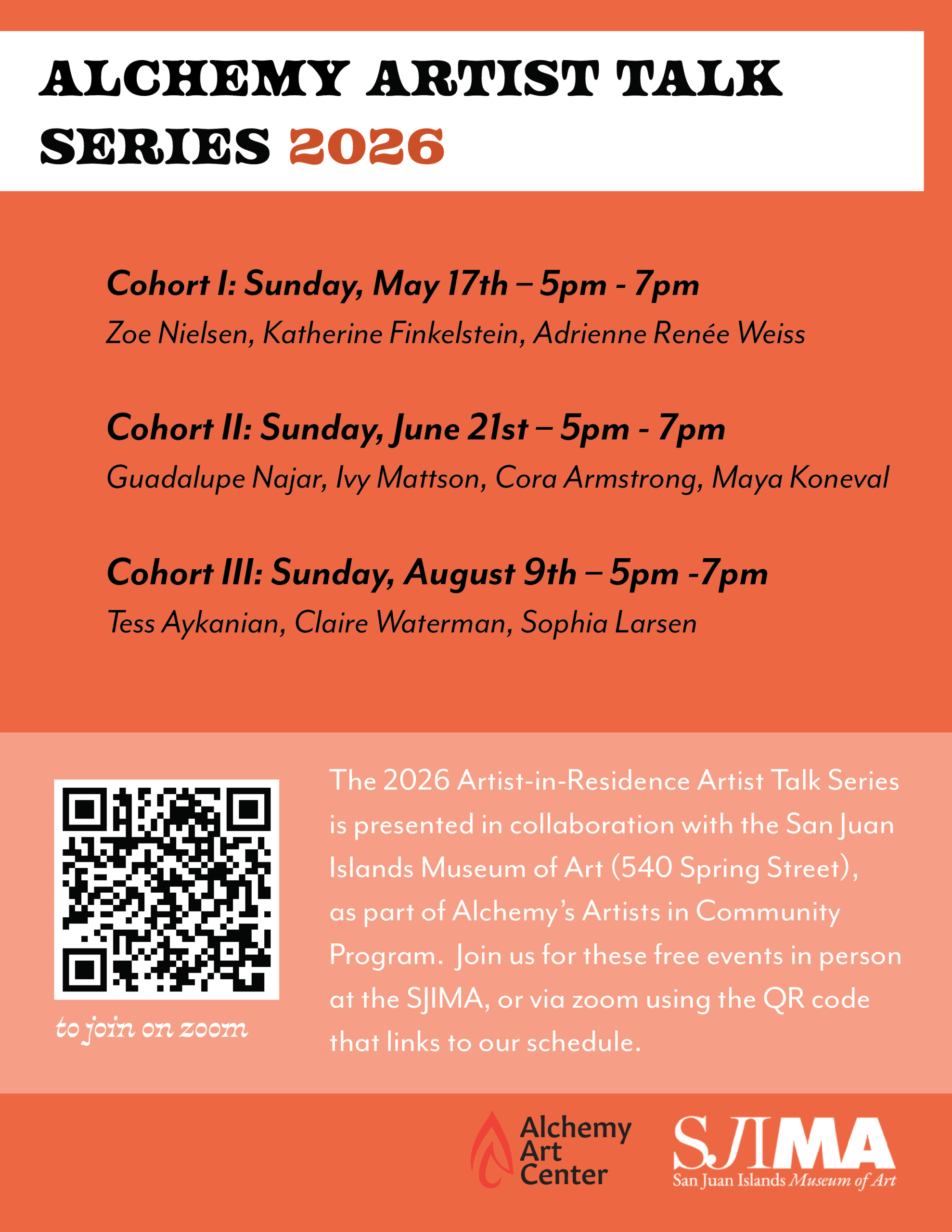 Join us for the first installment of our 2026 Artist-in-Residence Artist Talk Series, presented in collaboration with the San Juan Islands Museum of Art! Artists-in-Residence Zoe Nielsen, Katherine Finkelstein and Adrienne Renee Weiss will each present. Read more about all of our AIRs on our website: https://alchemyartcenter.com/2026-artistsinresidence If you can’t join us in person, you […]